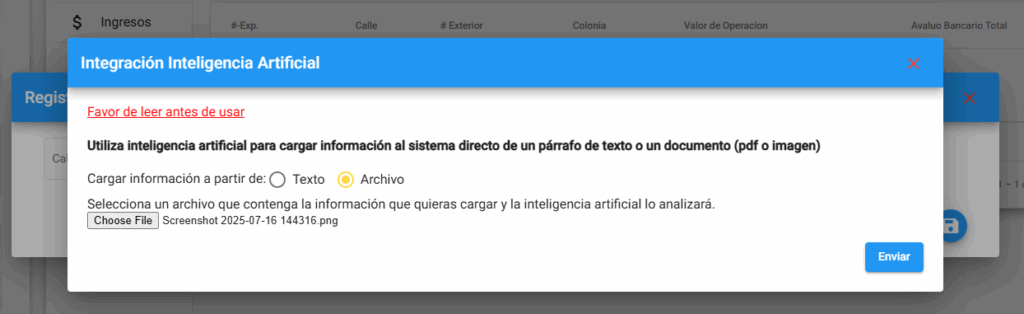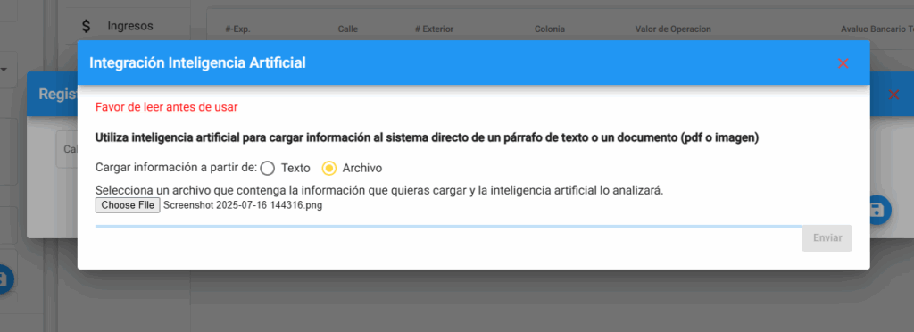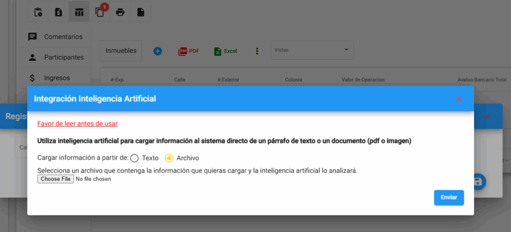 Tenemos una nueva implementación haciendo uso de la Inteligencia Artificial, para poder ayudar al ingreso de la información, puedes ver un información detallada acerca de esto en el siguiente enlace. En esta guía te mostraremos los pasos a seguir para cargar información en el apartado de inmuebles, usando la herramienta de inteligencia artificial.