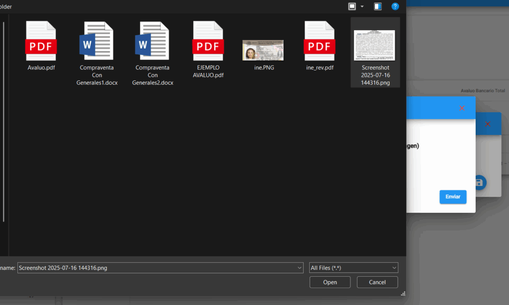 Por ejemplo, si vas a subir una captura en el apartado de Inmuebles, debes recortar únicamente los datos correspondientes a un solo inmueble. Si en la captura aparecen datos de varios inmuebles, el sistema no podrá identificar correctamente a cuál pertenecen los datos.